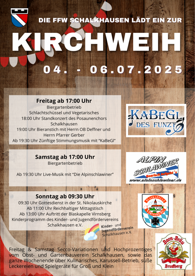 Wir laden ganz herzlich ein zur Kirchweih nach Schalkhausen!Neben gutem Essen und Getränken wartet ein buntes Programm für Jung
